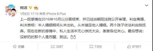 之后的事情大家就知道的差不多了,何洁和赫子铭在17年12月的时候开始打离婚官司。根据苏醒的微博可以推算出,何洁应该就是在离婚官司进行期间怀了孩子。