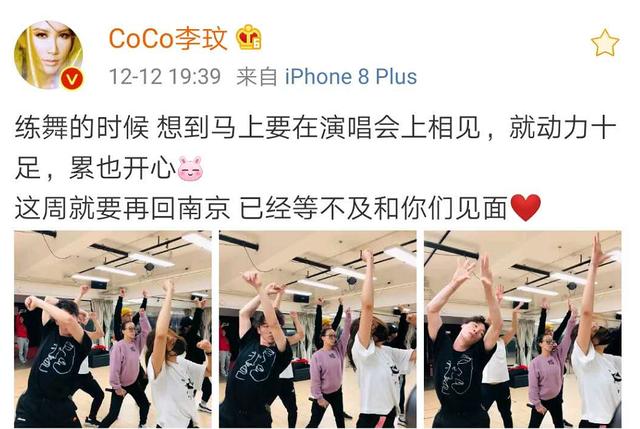 12月12日,李玟在社交网站上晒出了最新练舞的近照,当天李玟一身淡紫色运动服搭配紧身裤带着大墨镜在练习室练舞,女神站在中央气场十足!还配文表示为接下来的演唱会练习,累也开
