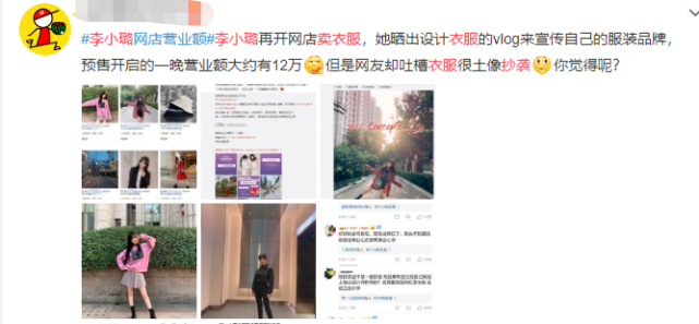 虽然是摆拍,但看起来还挺像模像样的……不过就在李小璐店铺开业不久,就有网友讨论起她店铺的营业额,据说是一天可以卖出800多件衣服,营业额一天能到12万。然而也有网友吐槽说李小璐卖的衣服太土了,有些款式也很像山寨货——