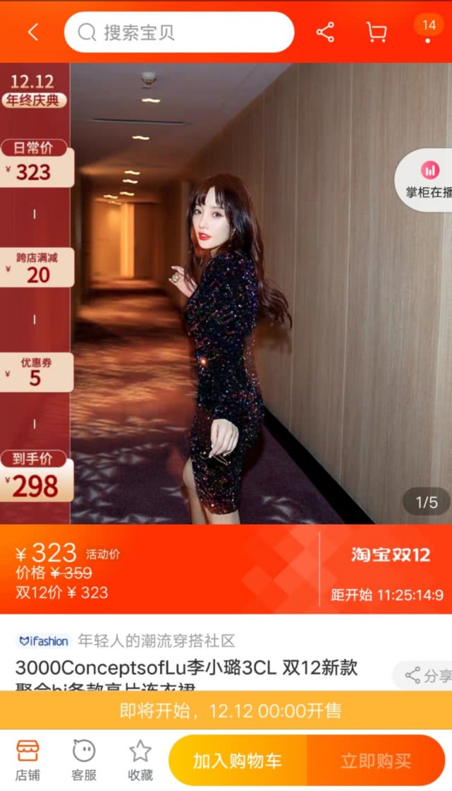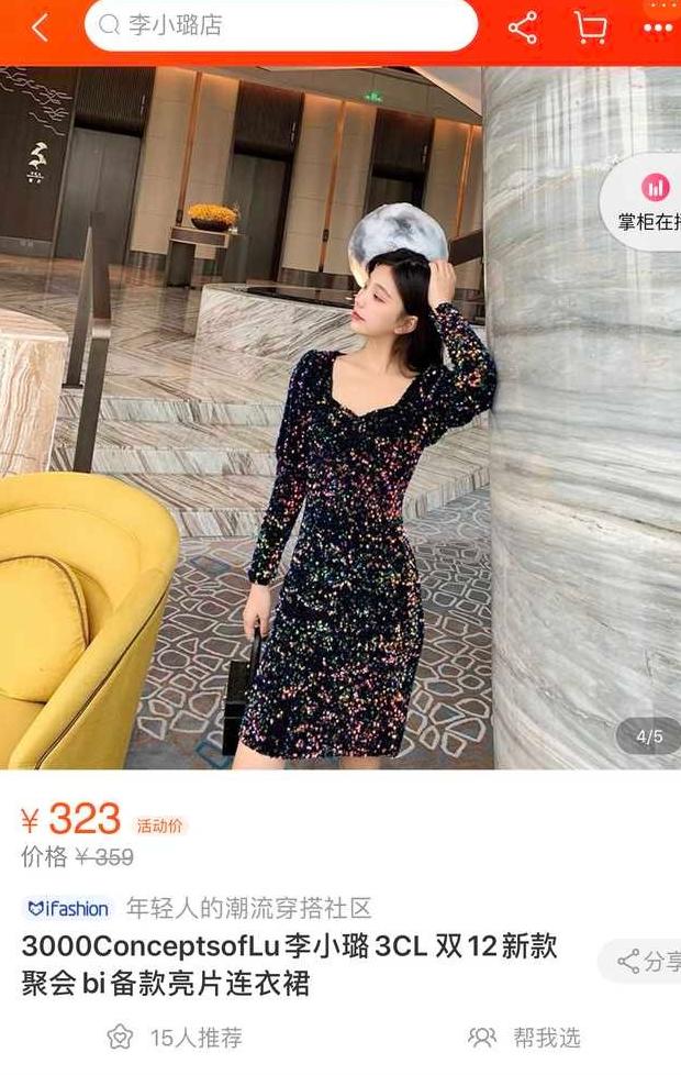 主宣传图还是李小璐自己拍摄的,只见她穿着这款亮片连衣裙在走廊中回眸一笑。可以看出裙子的修身效果不错,将李小璐的身材勾勒得凹凸有致。