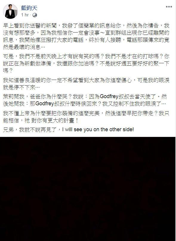 此后,蓝钧天冒雨去灵堂吊唁高以翔,其经纪人则表示得知高以翔离世消息后消息后,蓝钧天一整天都十分伤心说不出话。而高以翔好友毛加恩的婚礼上,吴建豪与蓝钧天互相拥抱,面色凝重。