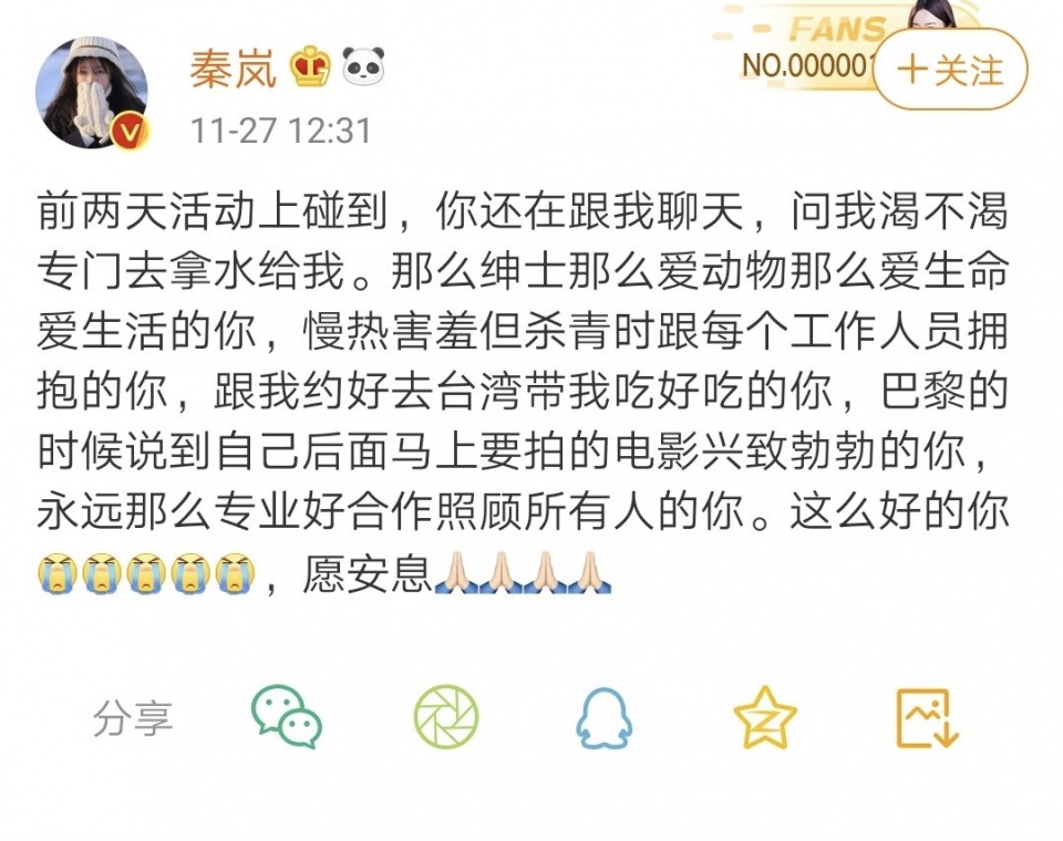 秦岚在高以翔去世的当天,也更新了一条微博。她说:“前两天活动上碰到,你还在跟我聊天,问我渴不渴专门去拿水,你那么绅士那么爱动物,那么爱生命爱生活,慢热害羞,杀青时会跟每个工作人员拥抱,跟我约好去台湾带我去吃好吃的,永远那么专业好合作照顾所有人。这么好的你,愿安息”。