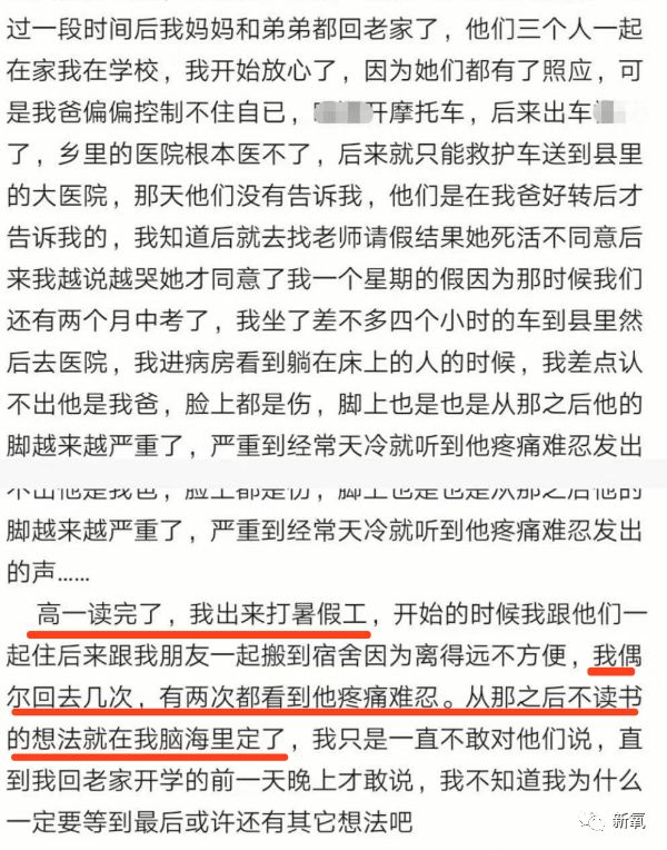 再加上爸爸因为工作太辛苦病情加重,家里的负担还是很大,所以她就打定了不再上学的主意。