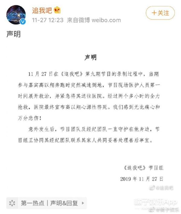 高以翔在录制综艺《追我吧》中昏厥,抢救无效而逝世。