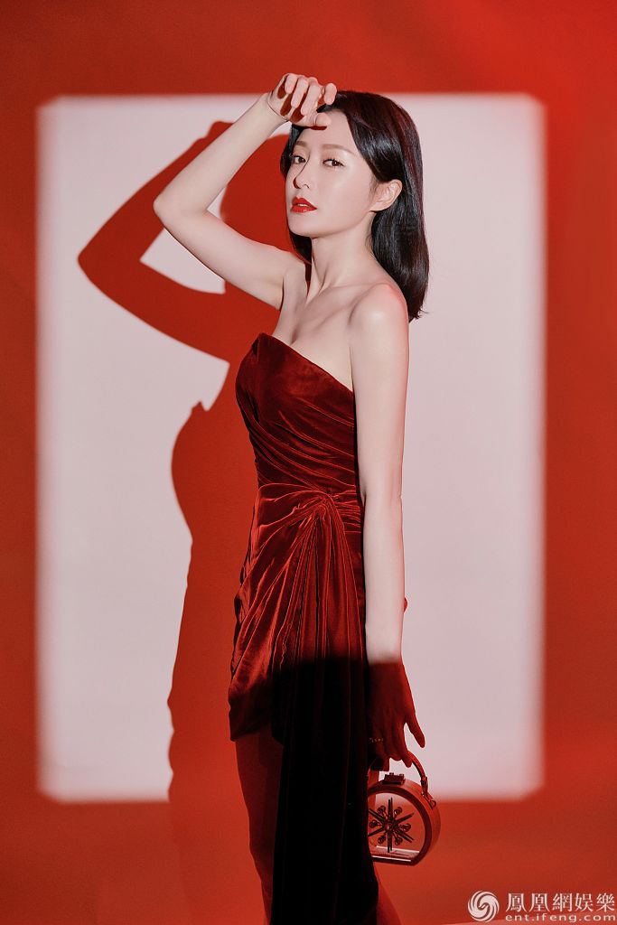 秦岚身穿酒红色丝绒裙秀香肩美腿。 图片来源:视觉中国/视觉中国