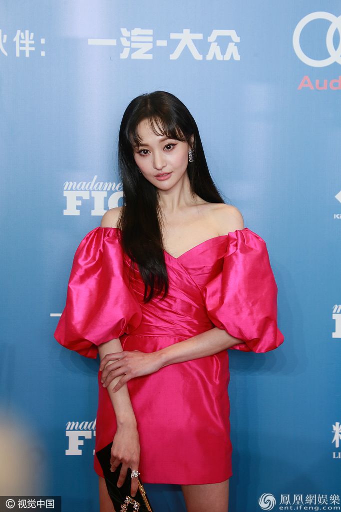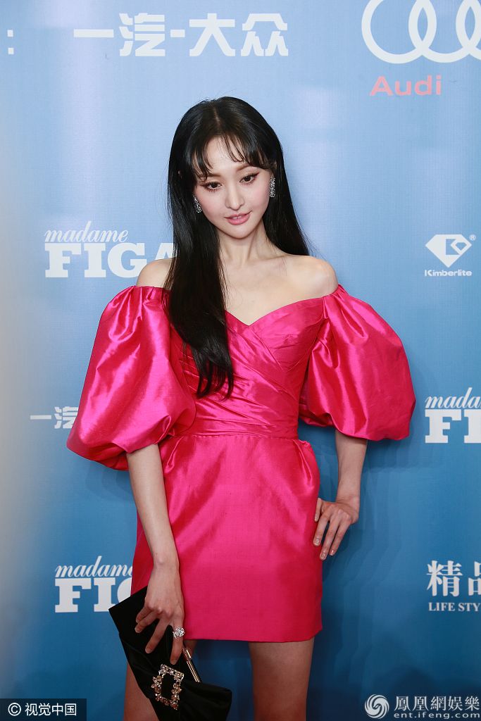 郑爽穿玫红露肩短裙秀香肩。 图片来源:视觉中国/视觉中国/视觉中国