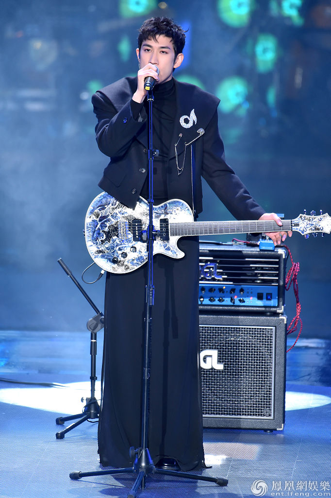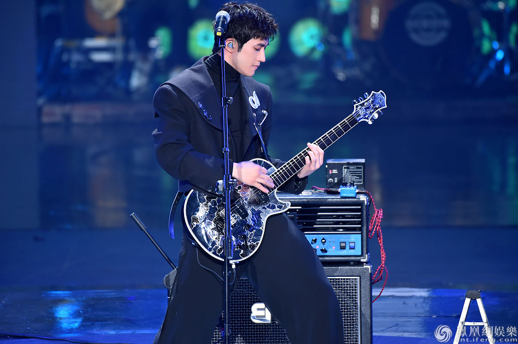全黑look背着电吉他的他现场自弹自唱《你不是真正的快乐》,舞台范儿十足。 图片来源:视觉中国/视觉中国