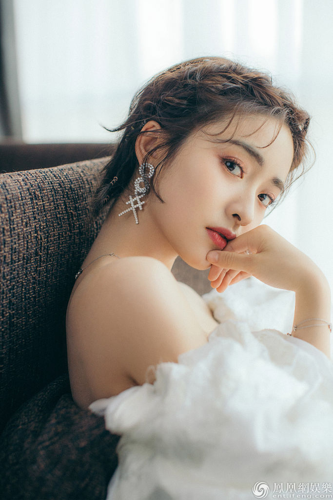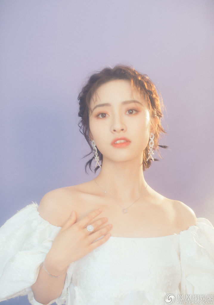 沈月身穿白色露肩泡泡裙清新洋溢,恬静嫣然。