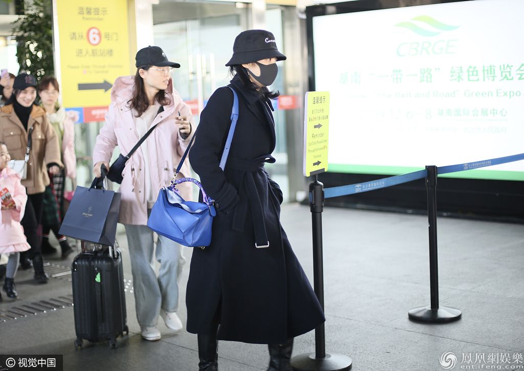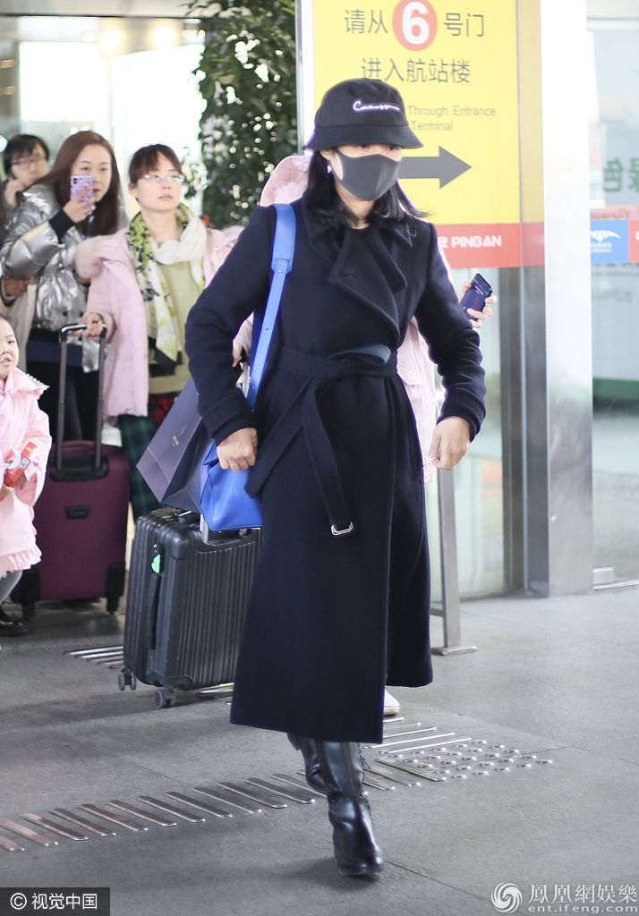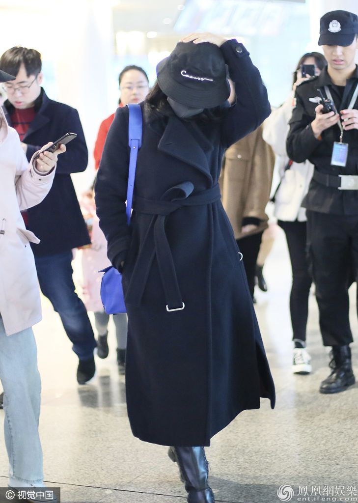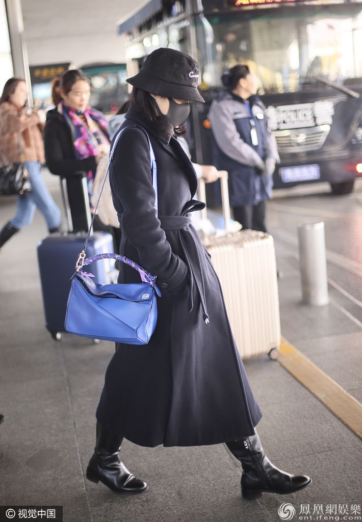 2019年12月7日,长沙,周涛现身长沙黄花机场,戴着渔夫帽和口罩的她穿着大衣和皮靴,背着抢眼的蓝色单肩包,一路疾走,气场十足! 图片来源:晓闻/视觉