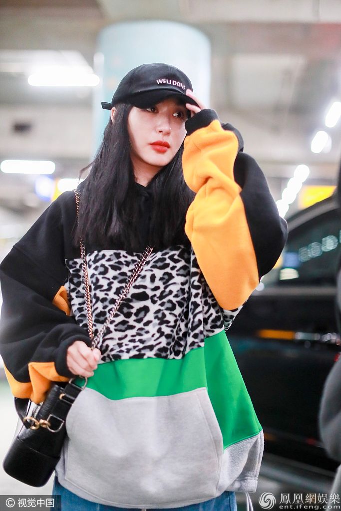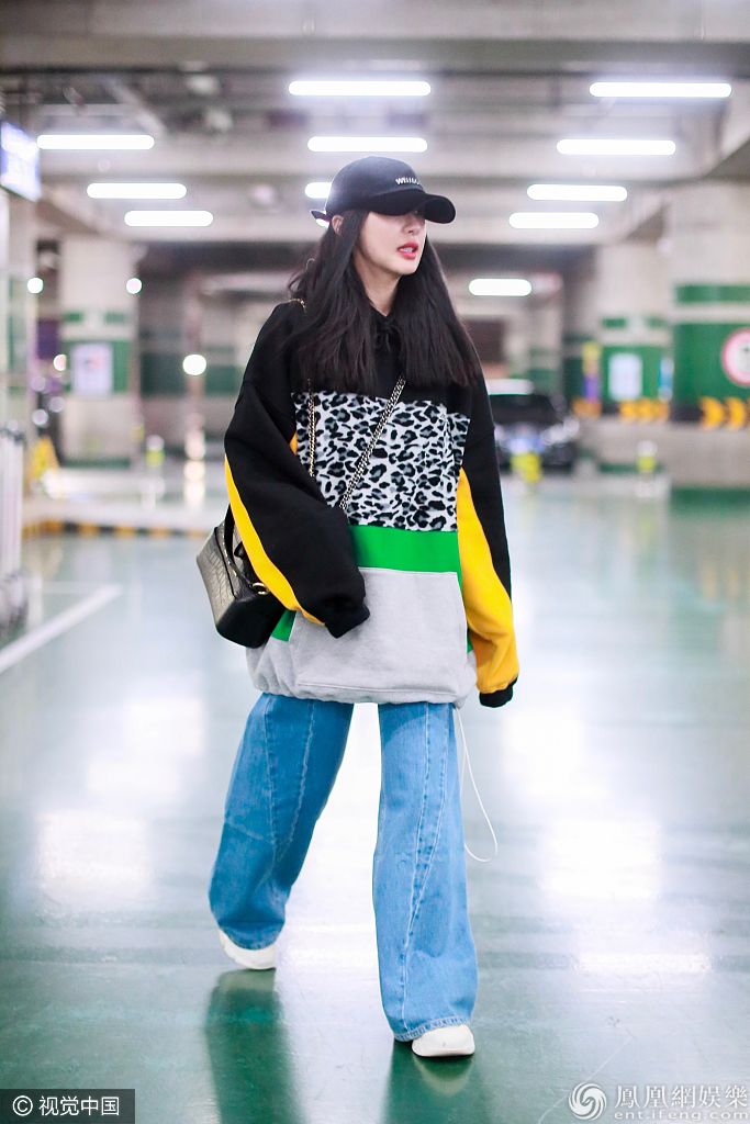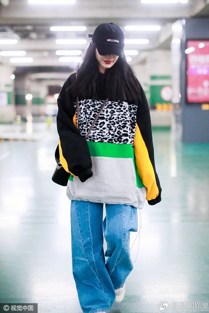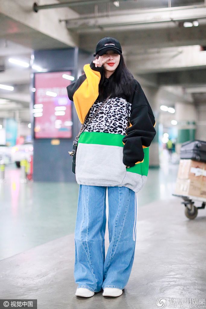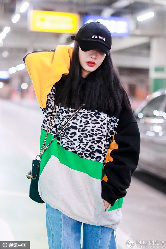 2019年12月6日凌晨,女星李菲儿从外地飞回北京现身机场,最近酷爱宽松服饰的她当晚戴着棒球帽,穿着多色拼接的oversize卫衣,搭配牛仔阔腿裤,街头风满满嘻哈范儿十足。 图片来源:视觉中国/视觉