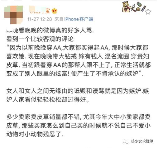 当然也有人认为,抓着晚晚穿动物皮草的行为不放,大多是出于女人对女人的嫉妒心理。