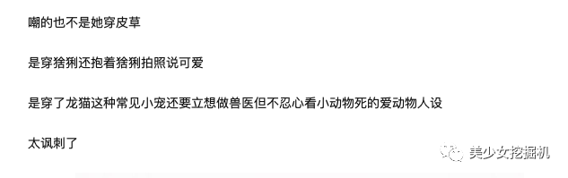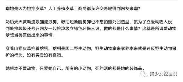 也有粉丝表示,你怎么知道晚晚穿的不是人工皮草呢?穿皮草和爱小动物冲突吗?接着又有网友扒出了晚晚拥有的皮草来历,几乎都来自同一家店。这家店里猞猁皮草售价40w起步,让大家觉得应该不是人工皮草。至于是不是人工的,你们自行判断,毕竟挖酱也没买过。