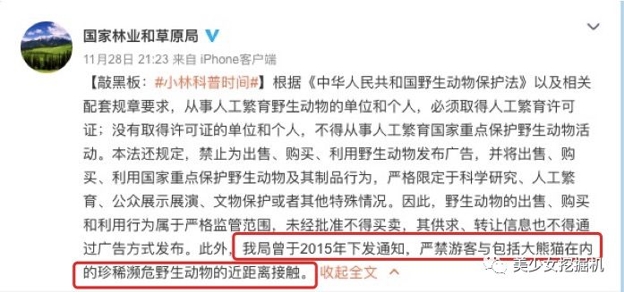 期间还发了条科普微博,反驳了林瀚说的“熊抱都可以抱”的言论。也告诉大家,野生动物是禁止出售、购买的。
