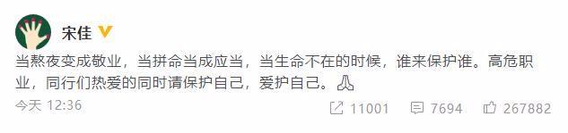 宋佳发文呼吁同行爱护自己:“高危职业,同行们热爱的同时请保护自己,爱护自己。”