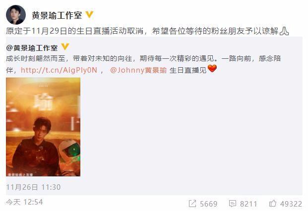 跟他一起录制节目的黄景瑜取消了原定11月29日的生日直播活动。