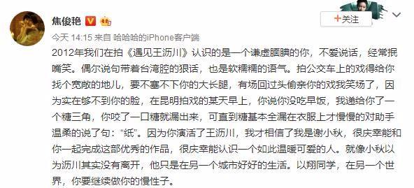 曾跟高以翔搭档主演《遇见王沥川》的焦俊艳则发长文回顾两人拍戏时的细节,大赞高以翔谦虚腼腆,待人温柔,而她文中一句“因为你演活了王沥川,我才相信自己是谢小秋”更令CP粉泪奔。