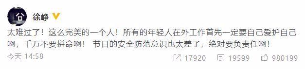 话又说回来,其实徐峥说得很有道理。因为据知情人透露,《追我吧》节目组并没有配备专业医生,高以翔倒地后是由非专业的工作人员帮他做心脏复苏,令他错过黄金抢救期,而且救护车十多分钟后才到达再场,同时有知情人爆料,节目组在高以翔倒地后仍然在拍摄,直到一起录制的嘉宾黄景瑜爆粗骂人才停止拍摄。