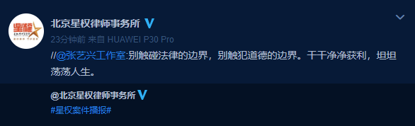 11月27日,北京星权律师事务所发布案件播报,宣布张艺兴名誉权案胜诉,获赔10万余元,并宣布将赔款全部捐献公益。随后,张艺兴工作室转发称“别触碰法律的边界,别触犯道德的边界。干干净净获利,坦坦荡荡人生。”