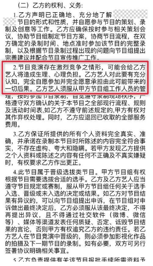 艺人合同曝光:要求艺人自愿参加并承担一切后果。