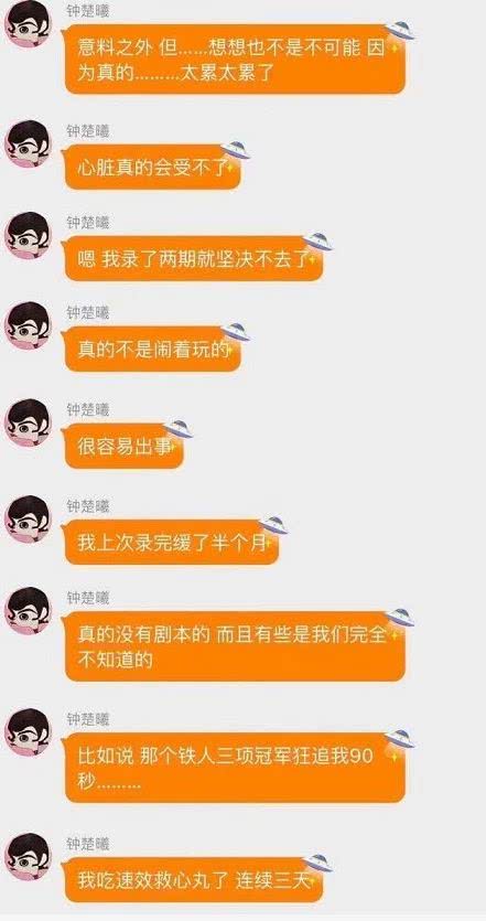 钟楚曦在自己的粉丝群中说,她被铁人三项冠军狂追90秒,节目录制结束吃了三天速效救心丸才缓过来。