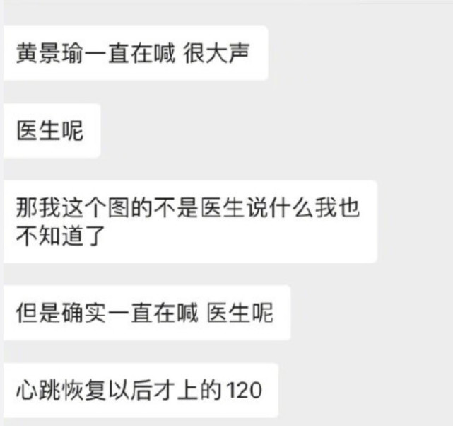 在之后的时间里,黄景瑜一直喊“医生呢”。而后有人员到达,抢救10分钟,心脏骤停3分钟。