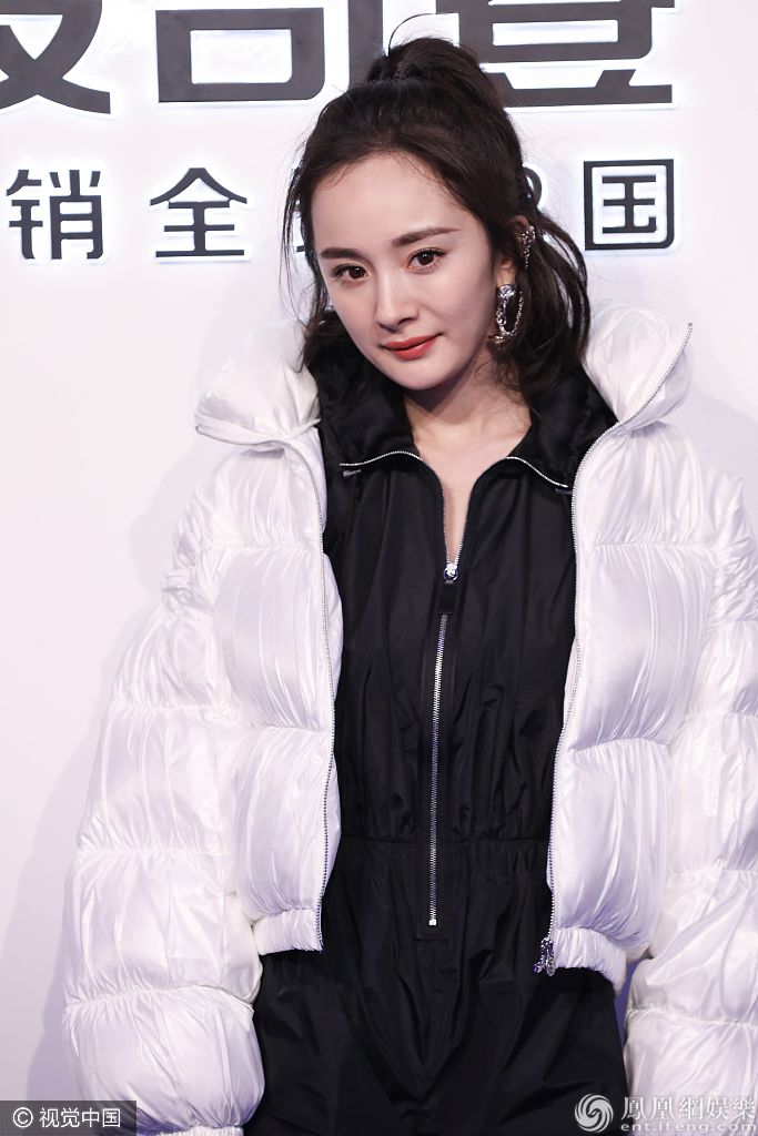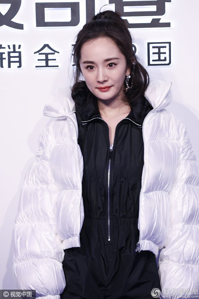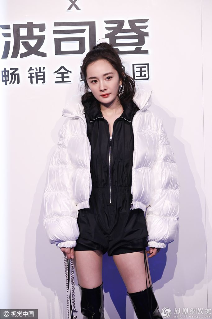 2019年11月27日,上海,杨幂出席波司登品牌活动。她扎高马尾戴个性耳环,穿白色外套内搭黑色连体裤,脚踩黑色高跟长靴露出美腿,完全少女感超媚! 图片来源:elyn/视觉