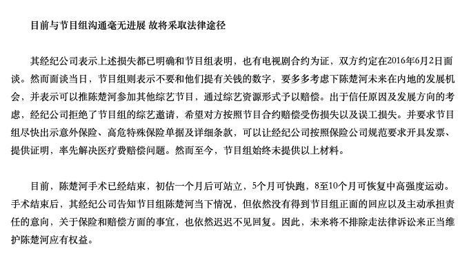 节目当时对外声明也是说会尽最大努力。 然而据陈楚河的团队说,医生是他们自己找的,康复师是同为节目嘉宾的王濛推荐的,节目组全程无作为。