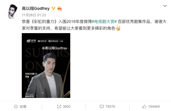 就在昨天半夜一点半左右,高以翔还更新了微博,庆祝自己入围电视剧大赏啊!