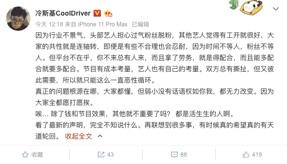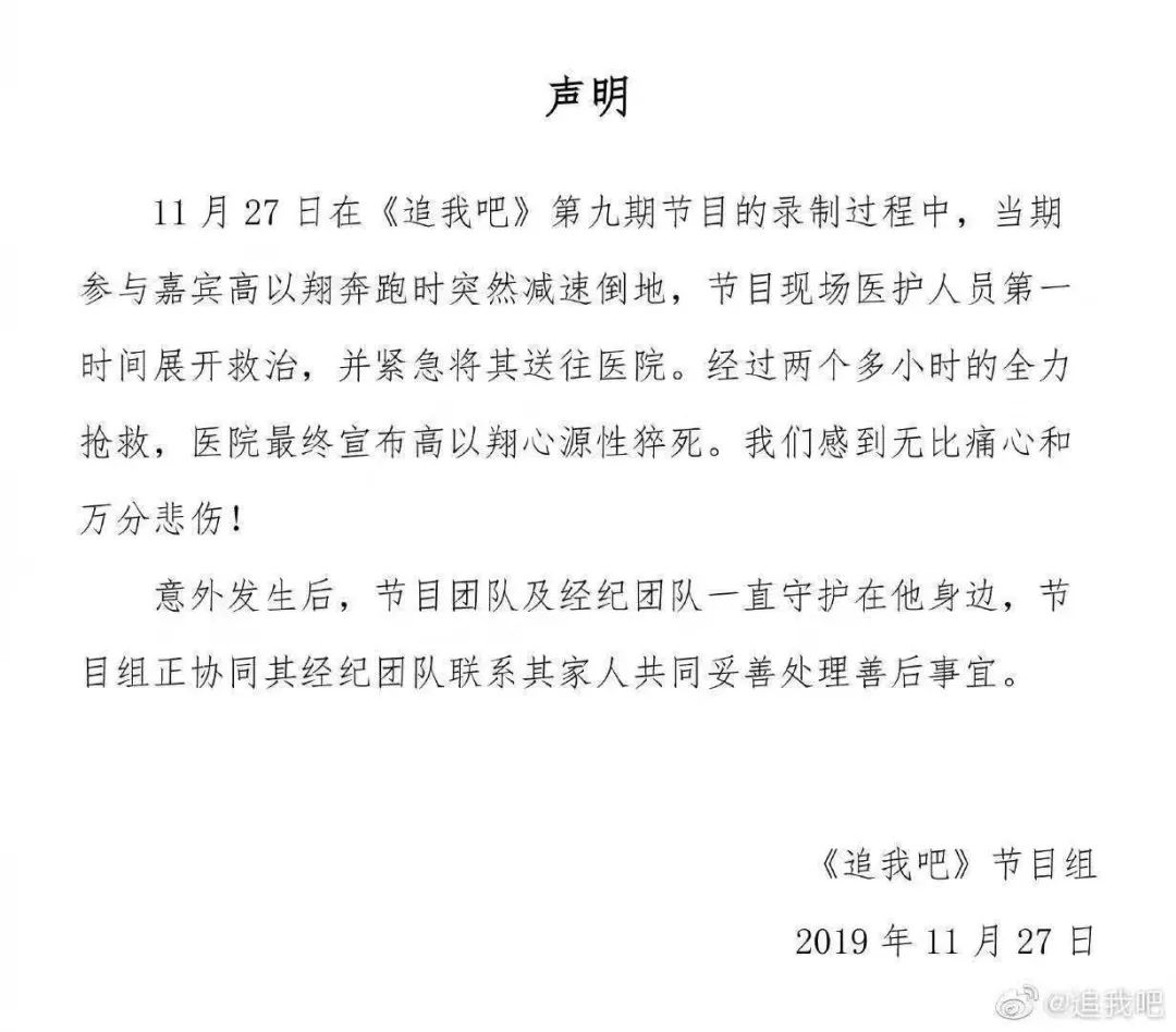 之后又过了几个小时,到十二点半,一直装死的节目组终于出了声明,然而语气官方,毫无有用的信息量,感受不到丝毫人情味,只顾着强调“第一时间救治”、“一直在他身边”。