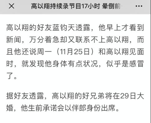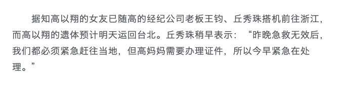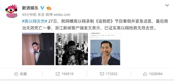 悬着一颗心等到11点左右,手机开始陆续收到新闻客户端开始推送,高以翔确认去世。