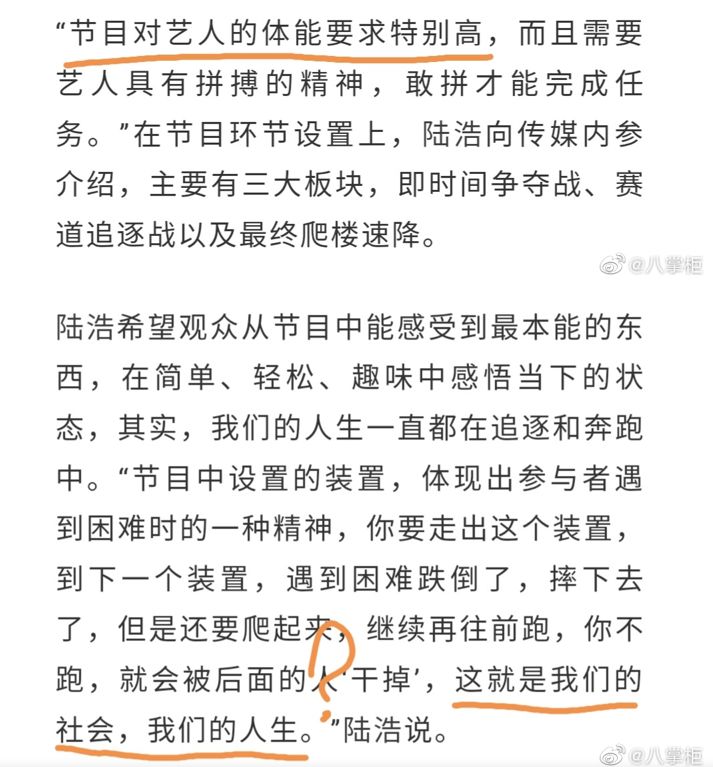在没出事之前,《追我吧》的幕后主创接受采访时,还骄傲地说他们的节目就是要让艺人拼搏、跌倒了还要继续坚持,否则就要被“干掉”。