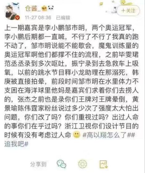 这和观众对节目的爆料是吻合的,微博上有粉丝发说,第二期除了邹市明,还有同为奥运冠军体力应该很好的李小鹏,但一样受不了节目的强度。