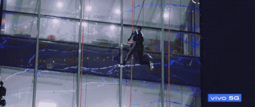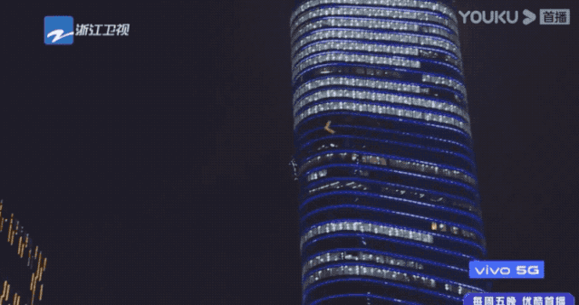 再从顶楼划悬空绳索到对面的高楼,这张图里滑索的是陈伟霆。