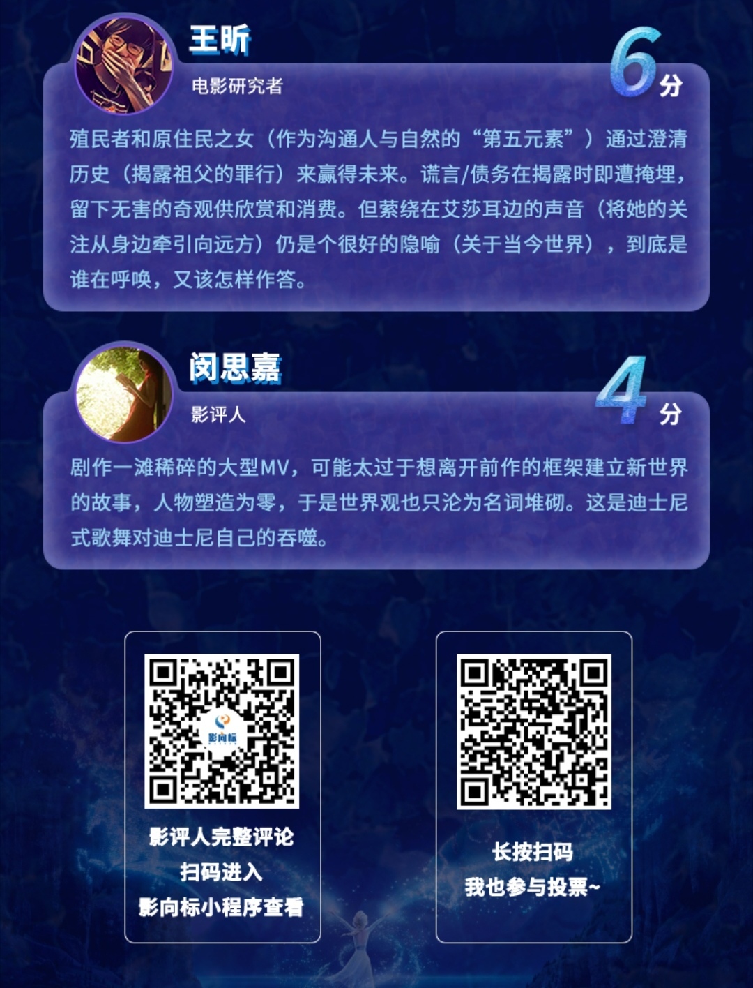 影评人闵思嘉为电影打分4分。他评价电影是剧作一滩稀碎的大型MV,太过于想离开前作的框架建立新世界的故事,人物塑造为零,于是世界观也只沦为名词堆砌。这是迪士尼式歌舞对迪士尼自己的吞噬。