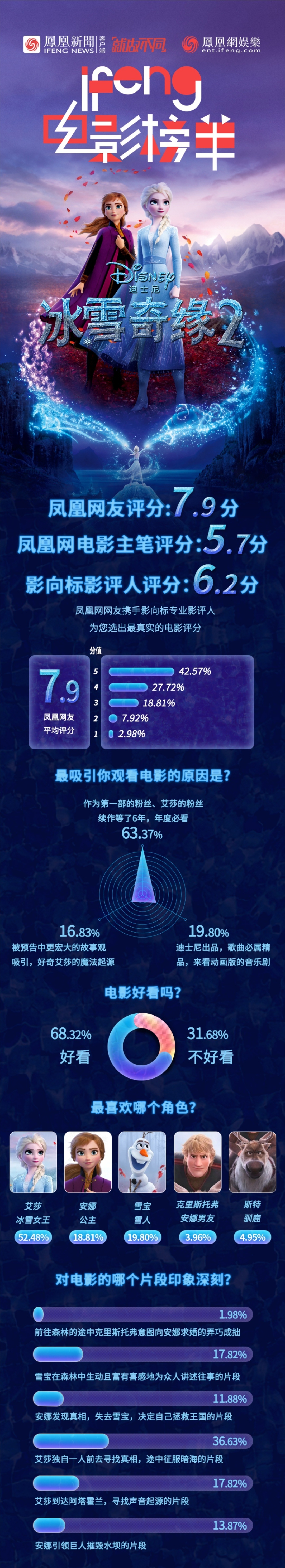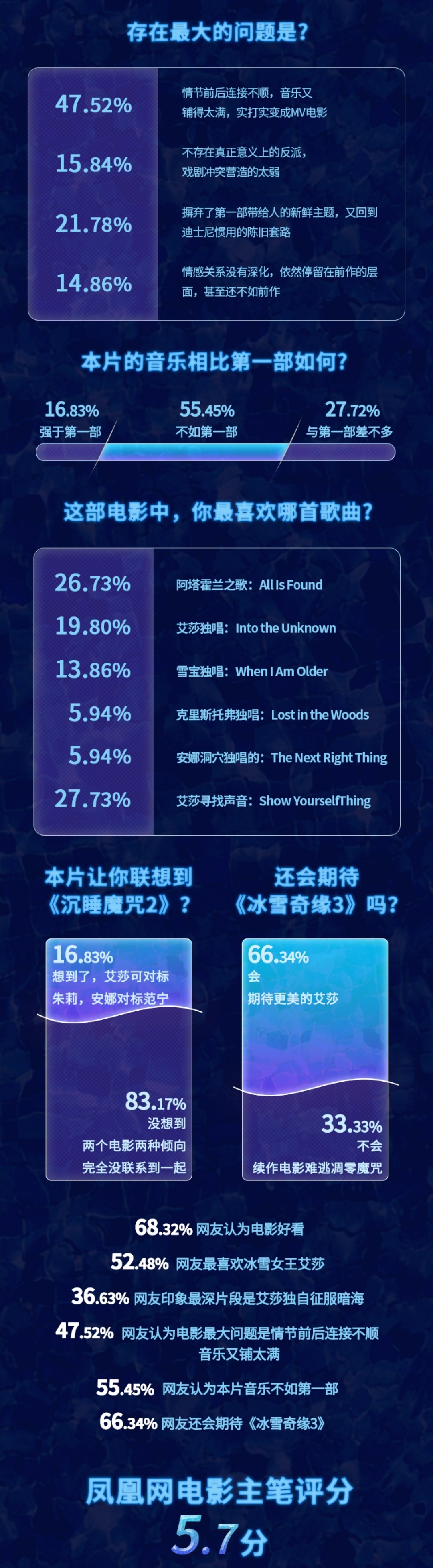 68.32%的网友认为电影好看;52.48%的网友最喜欢的角色是冰雪女王艾莎;36.63%的网友对艾莎独自征服暗海的片段印象最深;47.52%的网友认为电影最大的问题是情节前后连接不顺,音乐又铺得太满;55.45%的网友认为本片的音乐不如第一部;66.34%的网友会期待《冰雪奇缘3》。