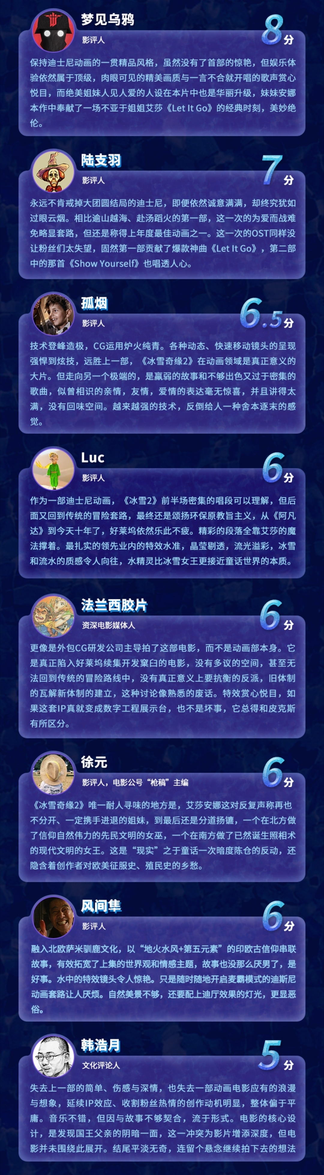“奇爱博士讲电影”责任主编,独立戏剧人耳朵为电影打出7分。他认为《冰雪奇缘2》是标准的迪士尼公主作品,完美无瑕世界观,大型音乐魔幻MV现场,最后加上触动G点的大女主结尾。虽然很无聊,但观众就是很吃迪士尼这一套。