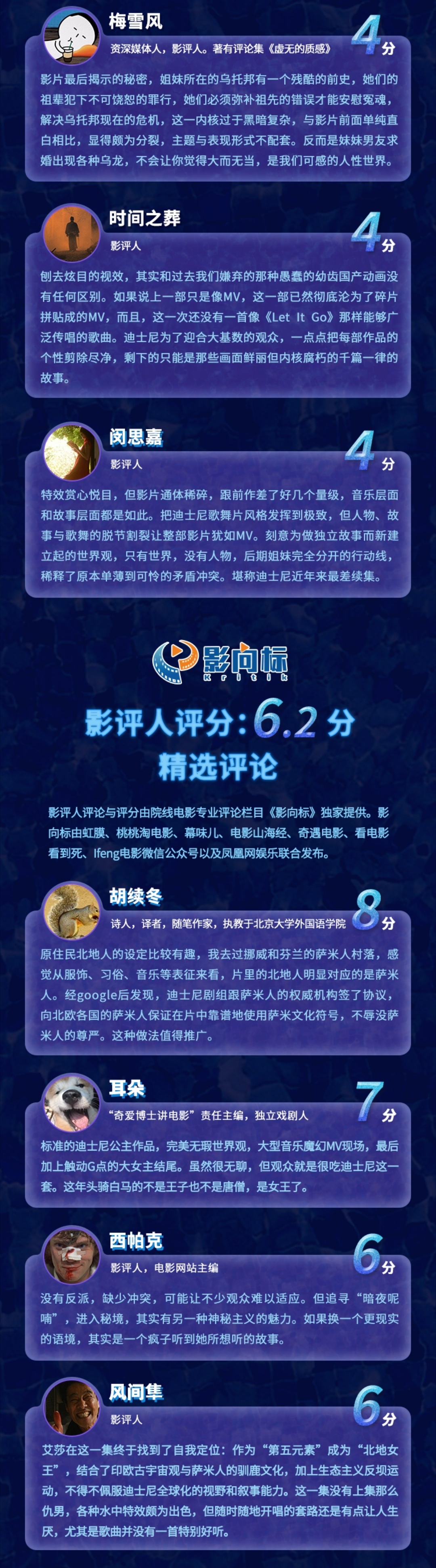 影评人时间之葬为电影打出4分的低分。他认为刨去炫目的视效,《冰雪奇缘2》和过去我们嫌弃的愚蠢的幼齿国产动画没有任何区别。迪士尼为了迎合大基数的观众,把作品的个性剪除尽净,剩下的只能是画面鲜丽但内核腐朽的千篇一律的故事。