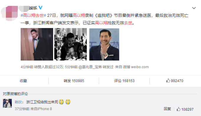 台湾明星高以翔在录制浙江卫视真人秀《追我吧》中途突然昏厥倒地无心跳,在抢救数小时后无力回天,他生命定格在35岁。