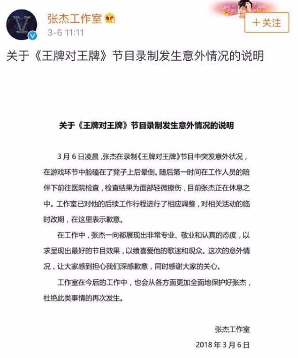 张杰在录制《王牌对王牌》玩游戏时因为缺氧晕倒,摔倒在了凳子上面导致面部淤青。