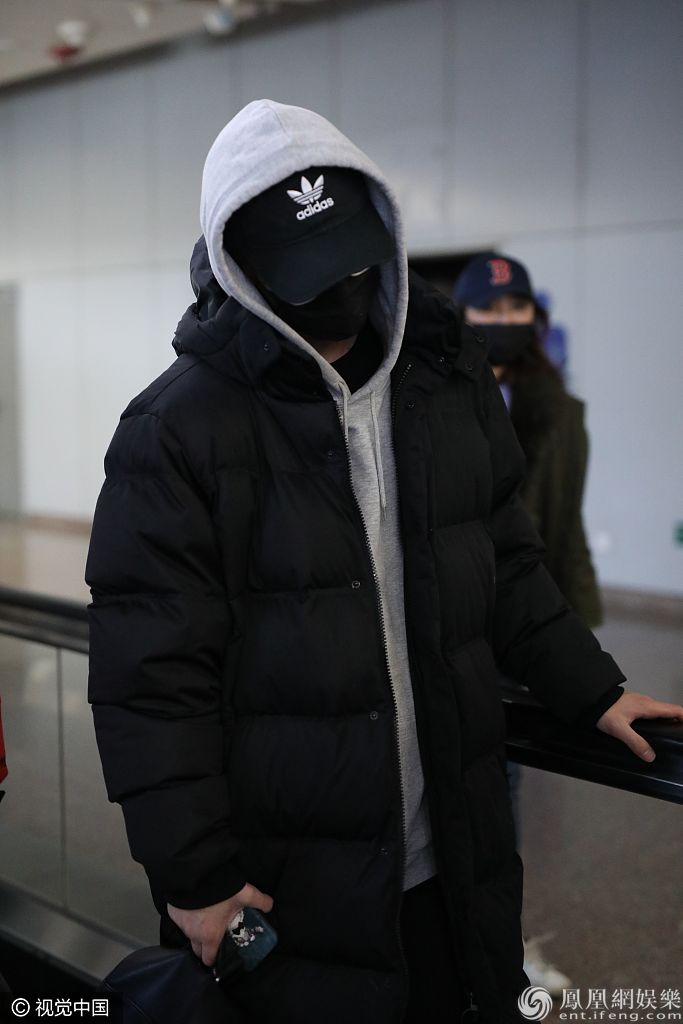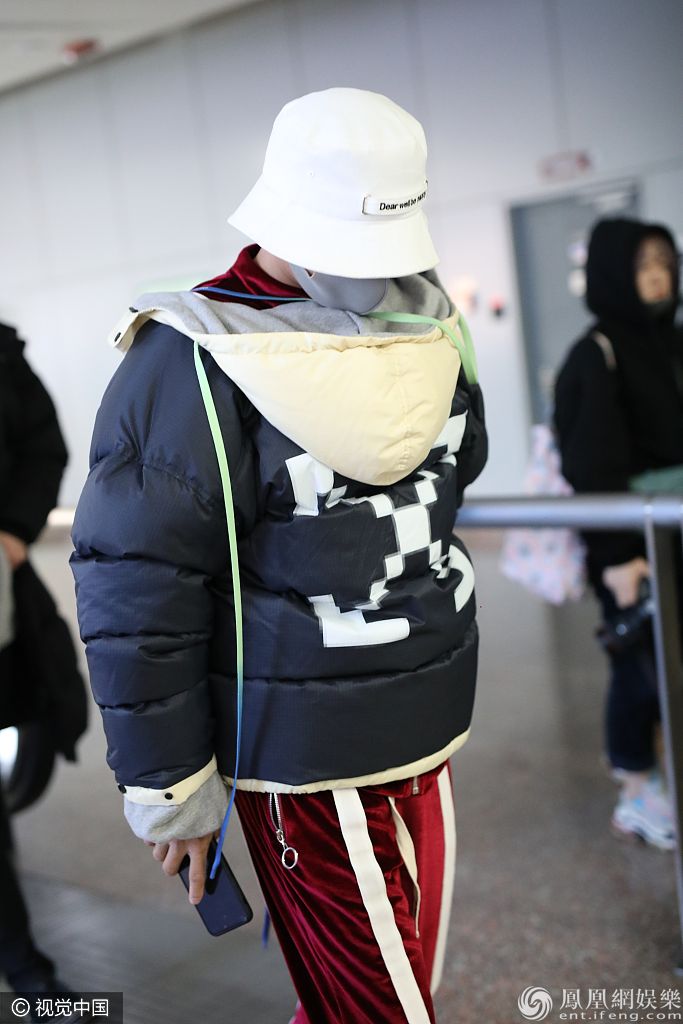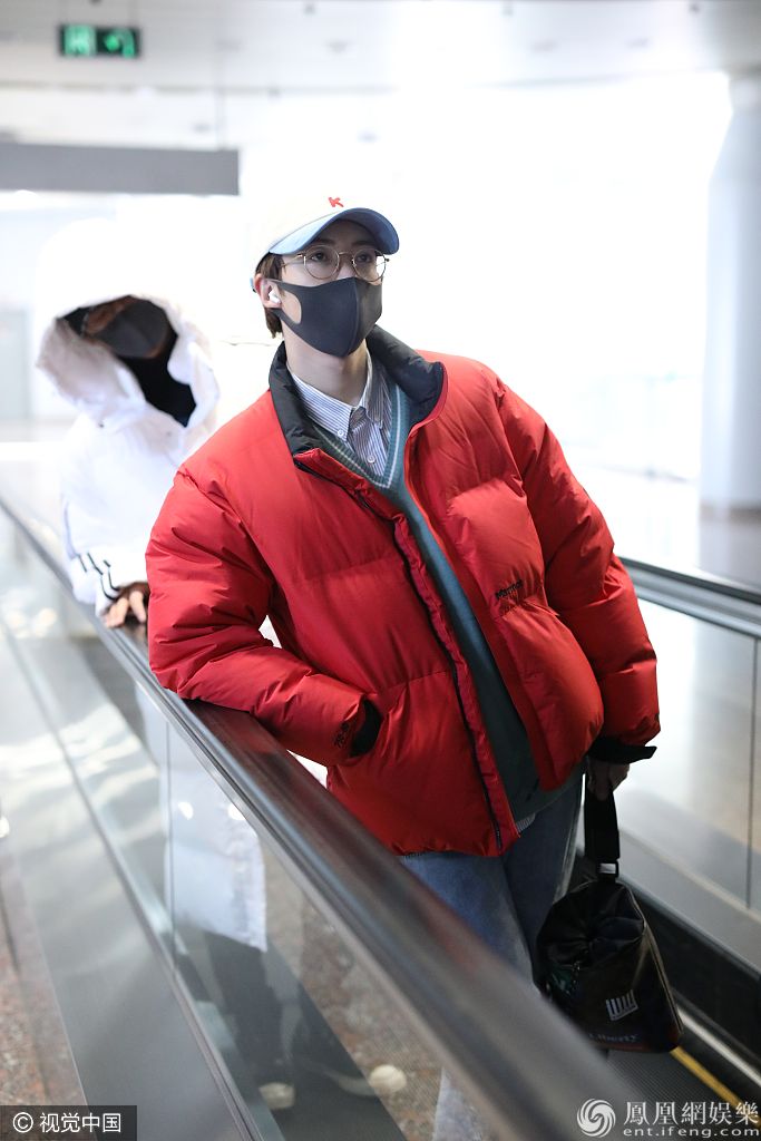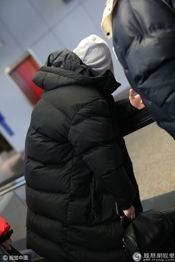 2019年11月27日,北京首都国际机场,日前UNINE成员结束通宵的节目录制乘坐早班机返回北京。图为姚明明大白天直接趴在扶梯上打瞌睡。 图片来源:视觉中国/视觉
