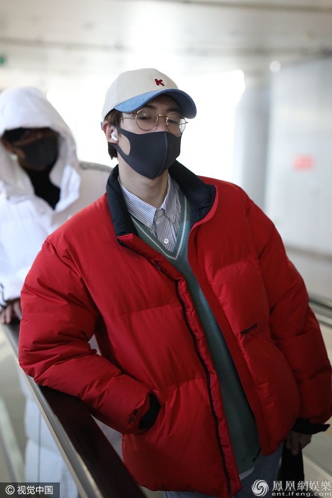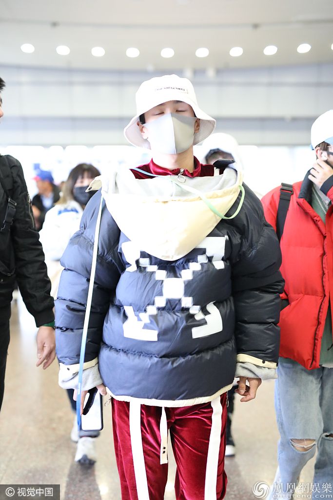 不知是通宵录节目太累、还是早起的原因,UNINE全员一脸疲惫。图为李汶翰闭着眼睛走路。 图片来源:视觉中国/视觉中国