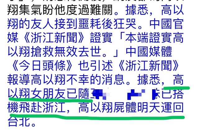 据台媒报道称,高以翔的友人在接到噩耗后狂哭,其未婚妻也已经随好友搭飞机赶赴浙江,其遗体将于明日运回台北。