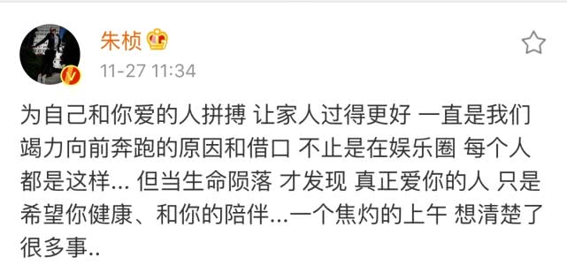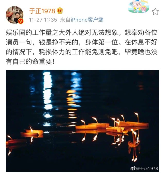 著名监制于正则发文:“奉劝各位演员一句,钱是挣不完的,身体第一位”,主持人朱桢也表示:“当生命陨落,才发现,真正爱你的人,只是希望你健康和你的陪伴”。