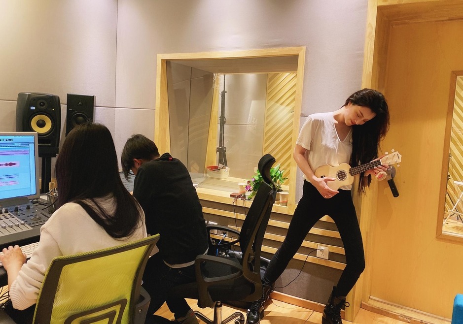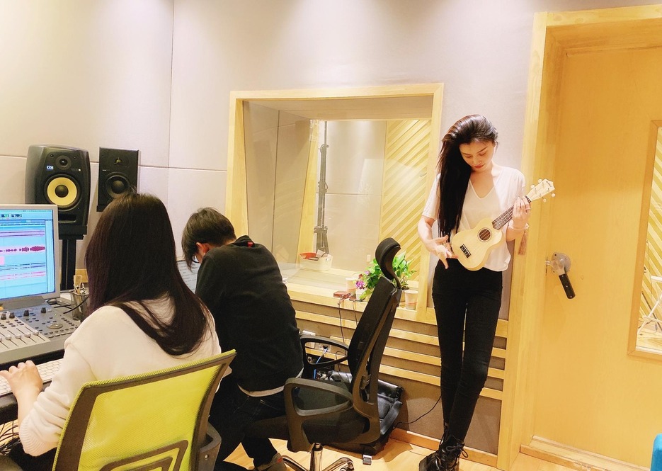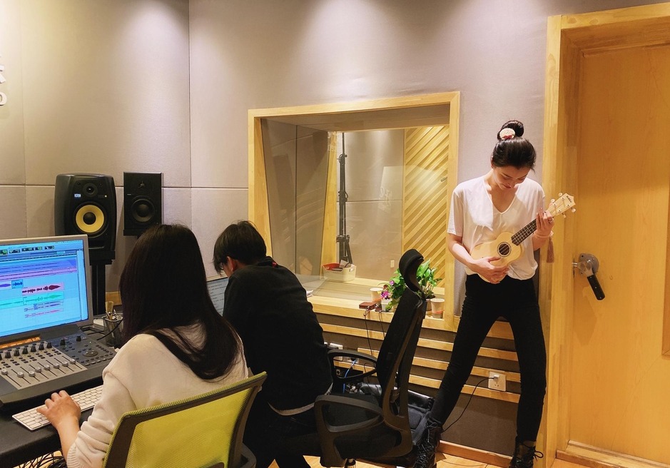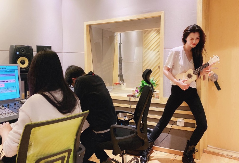 一组是在录音室内,葛天散着头发弹琴十分撩人。