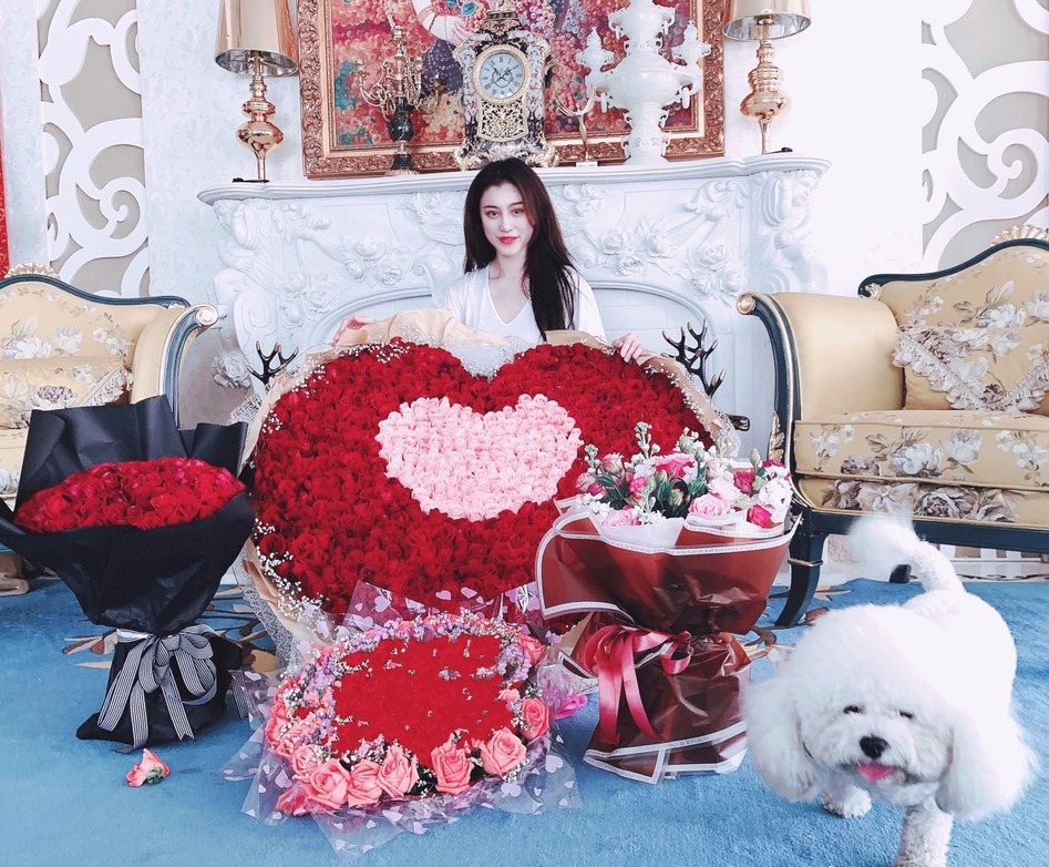 她进来似乎另有喜事,收到四束玫瑰花,巨型爱心造型非常惹眼。