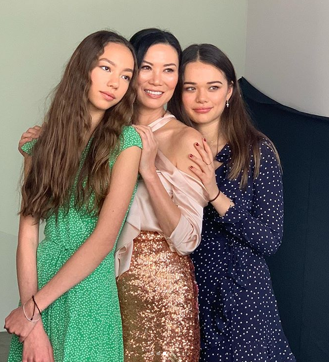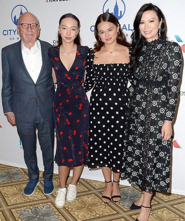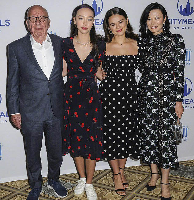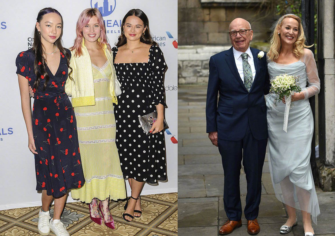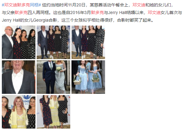 在活动上,邓文迪的两个女儿和默多克现任妻子的女儿关系非常好,三人如同姐妹一般亲切的合影,这也是自从2016年默多克和现任妻子结婚以来的再一次同框。
