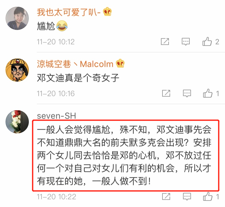从这次一家人公开的会面可以看出邓文迪的确是非常会抓住机会,对待社交场上的关系把握的非常精准,相信两个女儿在邓文迪的指导下也能快速融入各大社交圈啊。