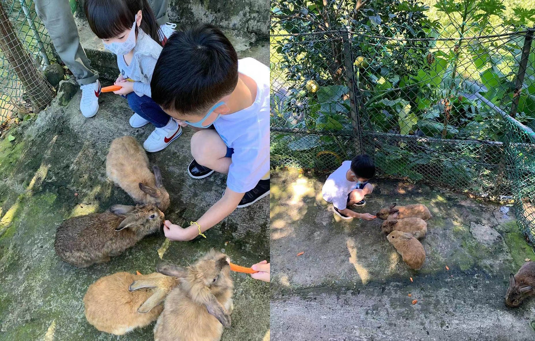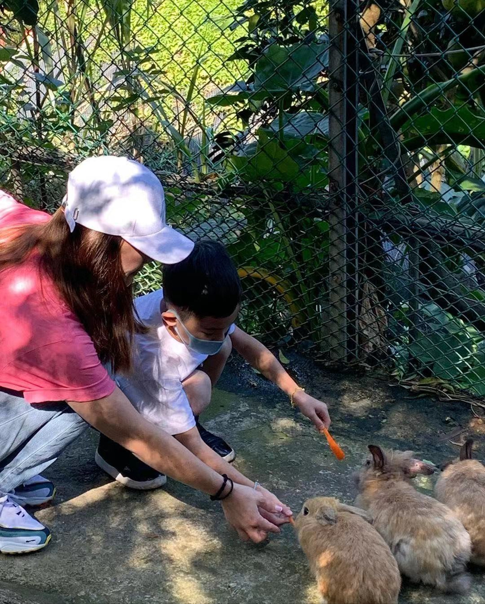 当天梁静茹和林湘萍一起带着孩子们外出游玩,只见两个小孩都带着口罩,一起喂兔子,很是欢乐。