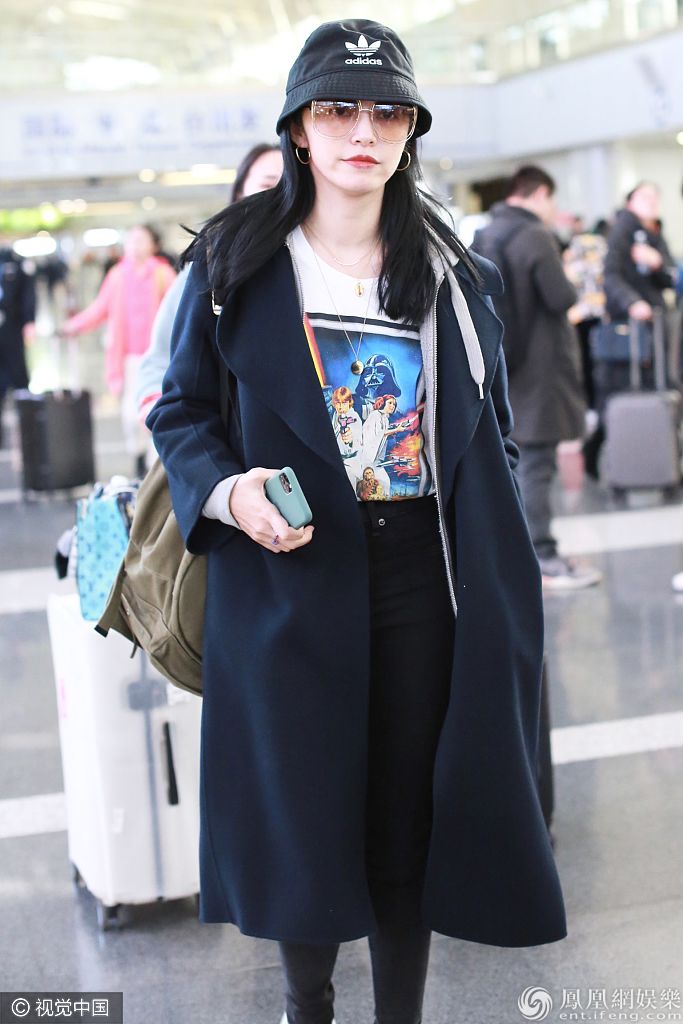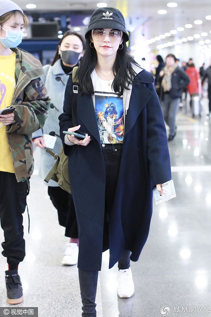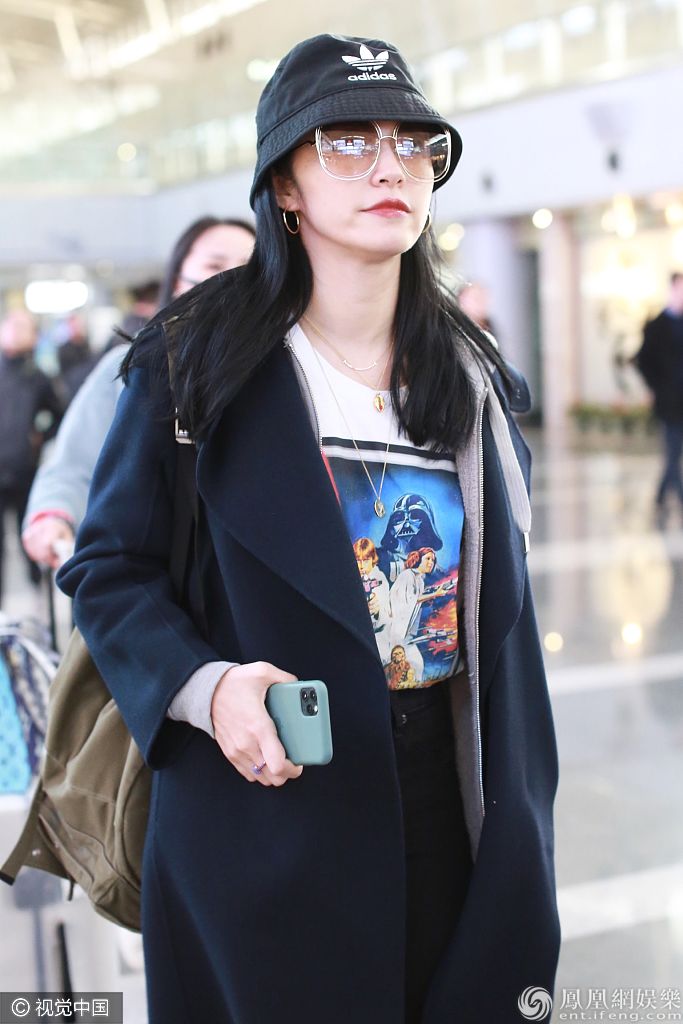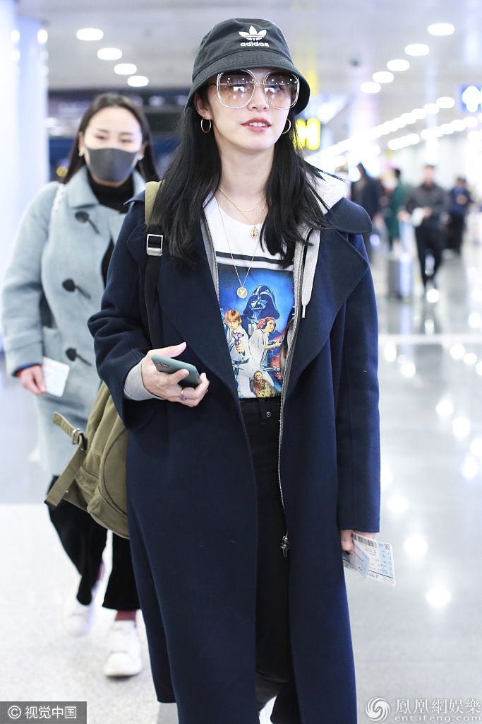 2019年11月18日,北京,姚晨现身机场。她戴“Y”字项链搭配《星球大战》T恤时尚有型 , 穿大衣美回“苏明玉“又酷又飒。据悉姚晨将出席金鸡百花电影节相关活动行程。 图片来源:ALO/视觉