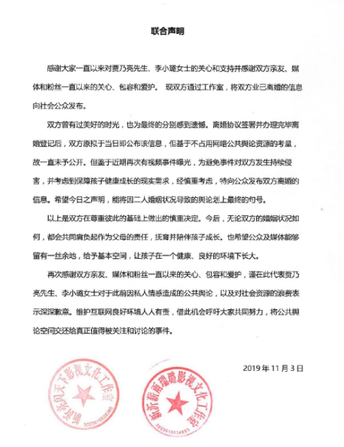 11月14日晚,李小璐和贾乃亮工作室同时发表声明,宣告两人7年的婚姻画上句点,未来将共同抚养女儿甜馨,而拟定声明的日期是11月3日。